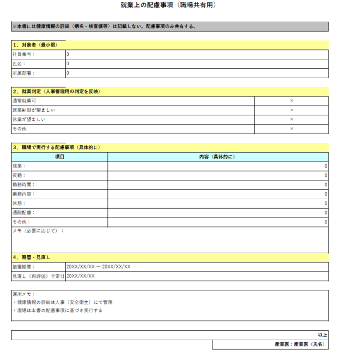 - 職場共有用(配慮のみ):職場が実行する配慮事項だけを記載(健康情報の詳細は書かない)