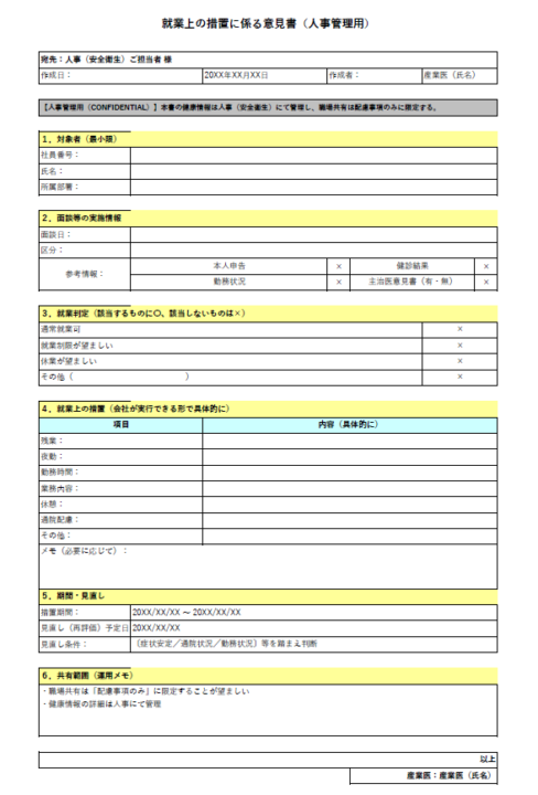 就業上の措置に係る意見書テンプレを無料配布します(人事管理用/職場共有用の2枚運用)