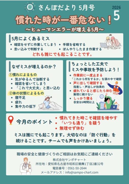 “健康新聞「さんぽだより」2026年5月号” をダウンロード 202605sanpo-dayori.pdf – 1 回のダウンロード – 940.49 KB5月は、新しい環境や業務に慣れてくる一方で、油断や思い込みが生じやすく、ヒューマンエラーが増加しやすい時期です。加えて、寝不足や疲労の蓄積により集中力が低下し、ミスが起こりやすい状態になります。