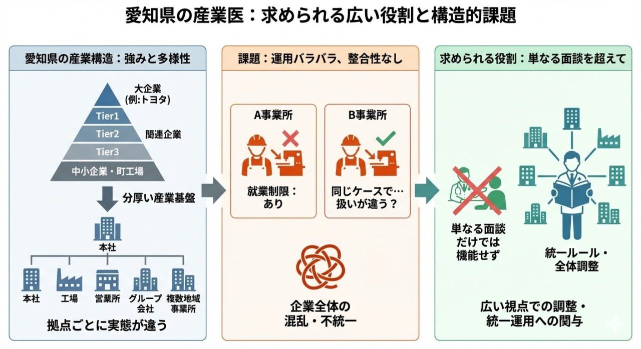 愛知県で産業医が本当に機能するためには、単に面談をするだけではなく、こうした多拠点運用や標準化の難しさまで見据える必要があります。