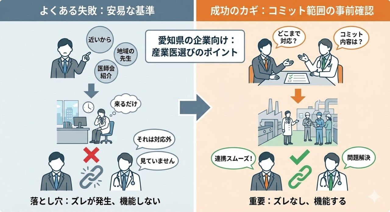 それは、愛知の企業は産業医を「探す」こと自体よりも、「機能する形で選ぶ」ことが難しいということです。