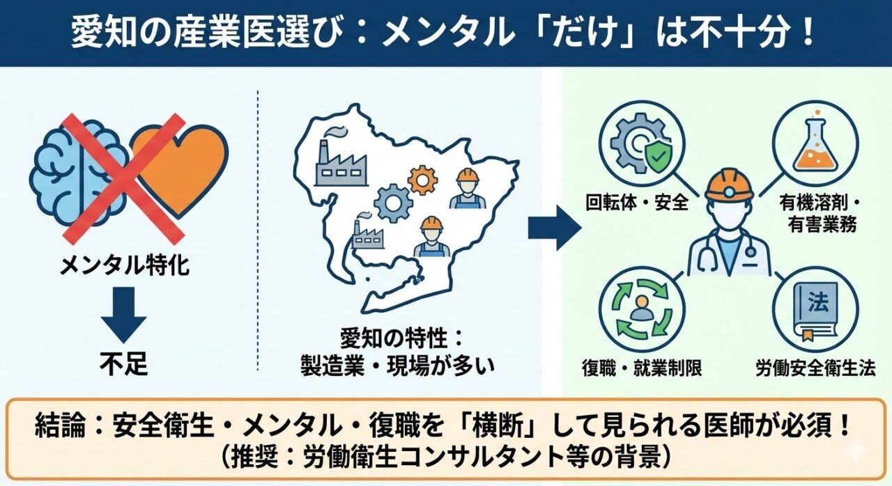 愛知県の産業医選びで特に気をつけたいのは、“メンタルヘルスに強いかどうか”だけで選ばないことです。