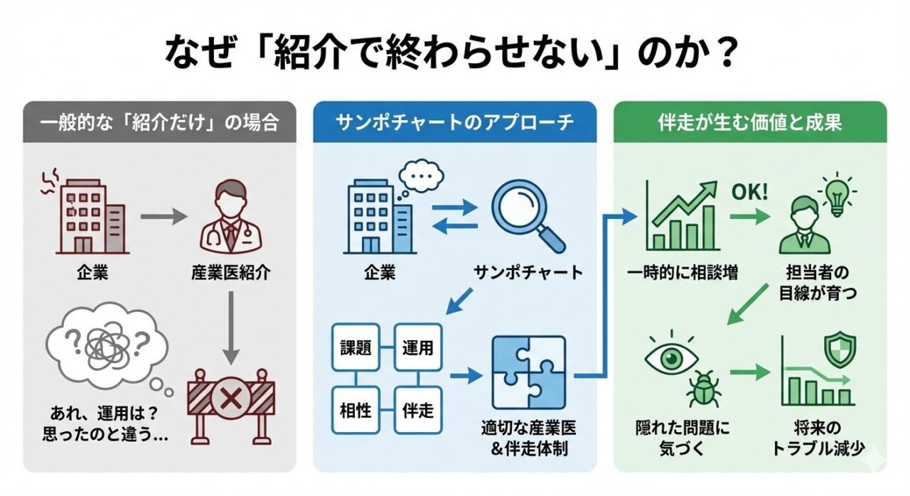 サンポチャートでは、産業医を紹介する前に、まず企業の課題をできるだけ深く掘り下げることを重視しています。