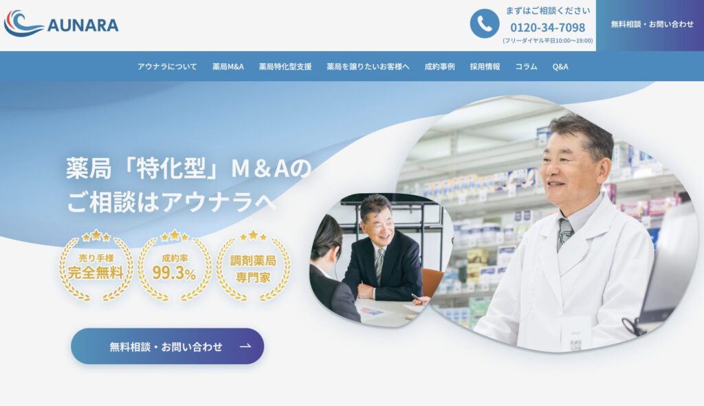 株式会社アウナラは、調剤薬局に特化したM&A仲介会社で、薬局の事業承継や譲渡/買収を中心に支援している企業です。同社は薬局の存続支援・雇用促進・地域医療の質向上を目的に掲げ、方針に沿ったサービス運用を行っています。事業はM&A仲介のほか、薬局運営・コスト適正化支援、薬歴システムの提案、人材関連支援までワンストップで展開しているそうです。 また自社メディアで業界解説、価格相場、事例集などを情報発信ししています。