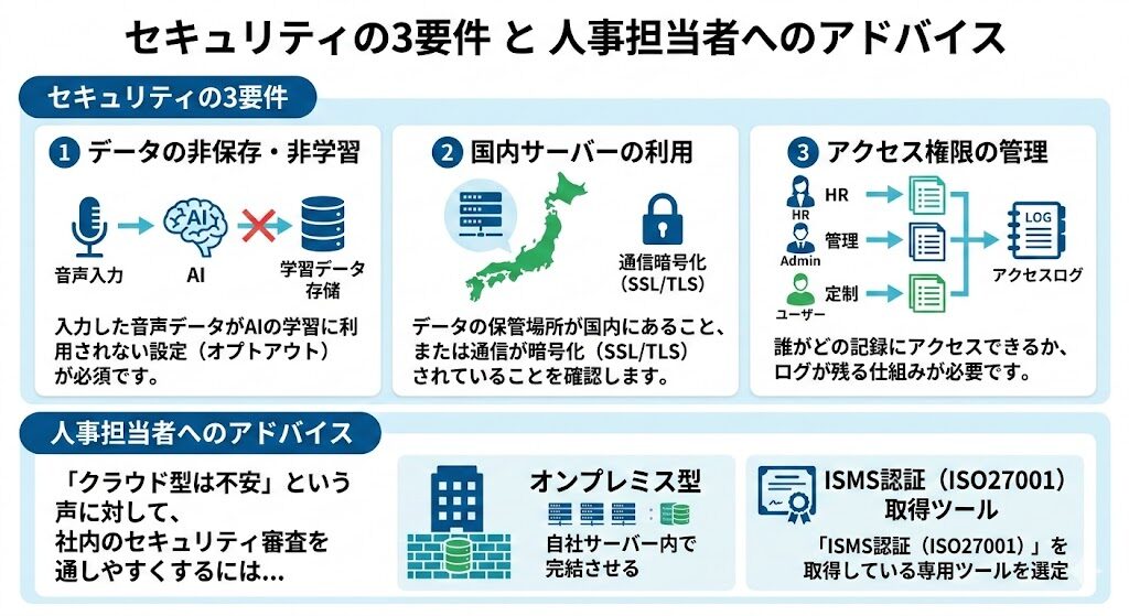 1. データの非保存・非学習: 入力した音声データがAIの学習に利用されない設定(オプトアウト)が必須です。