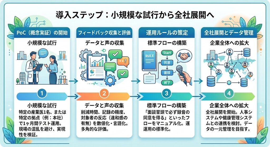 1. PoC(概念実証): まずは特定の産業医1名、または特定の拠点(例:本社)で1ヶ月間テスト運用を行う。