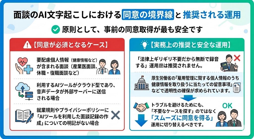 結論から言うと、面談時の音声をAIで文字起こしする場合、原則として事前の同意取得が必要と考えて運用するのが最も安全です。