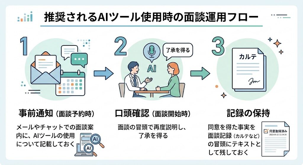 - 記録の保持: 同意を得た事実を面談記録(カルテなど)の冒頭にテキストとして残しておく。