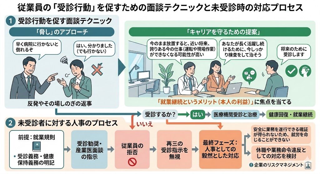 あなたがこの会社で長く活躍し続けるために、今しっかり検査をして治すための時間をとってほしい」と、「就業継続というメリット(従業員自身の利益)」に焦点を当てて受診勧奨を行うことが、最も納得感を生む効果的なアプローチです。