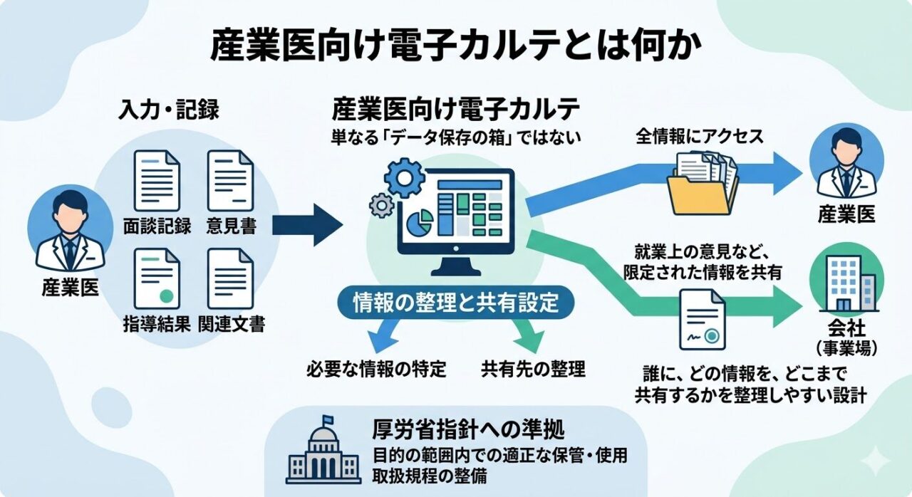 産業医向け電子カルテは、産業医面談や就業上の意見、面接指導結果、必要な共有文書などを、一定のルールのもとで記録・出力・保存・検索しやすくするための仕組みです。
