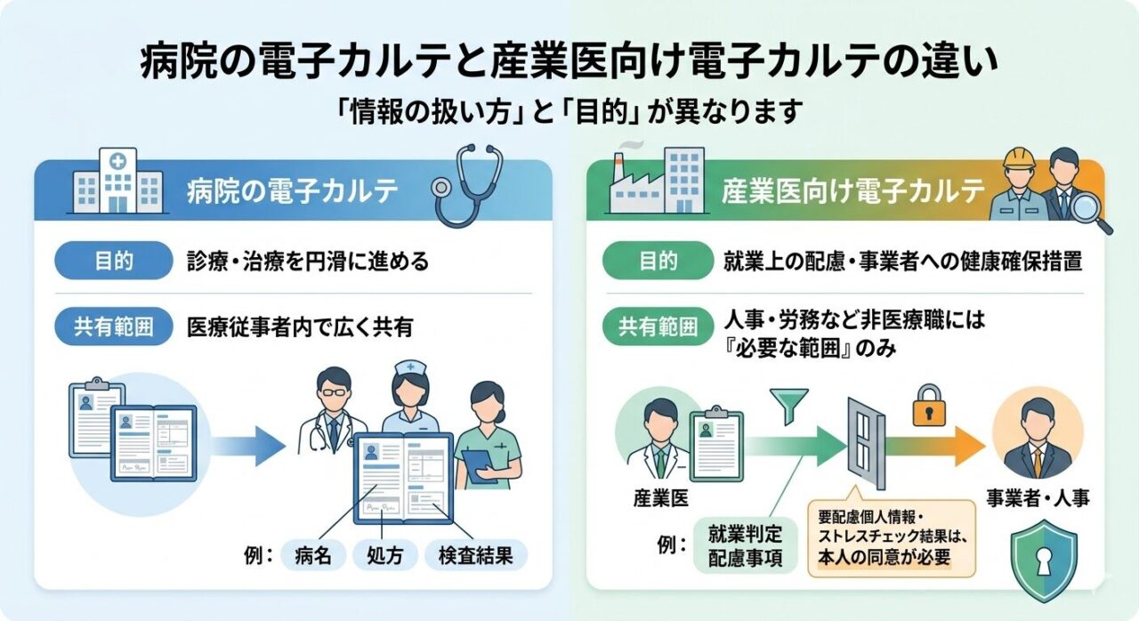 ただし、ここでいう電子カルテは、病院で使う電子カルテをそのまま産業保健に持ち込めばよい、という話ではありません。産業保健では、扱う情報の性質も、共有相手も、求められる統制も異なるためです。労働者の健康情報は要配慮個人情報に該当しうるため、取得や利用、共有の在り方には慎重な整理が必要です。