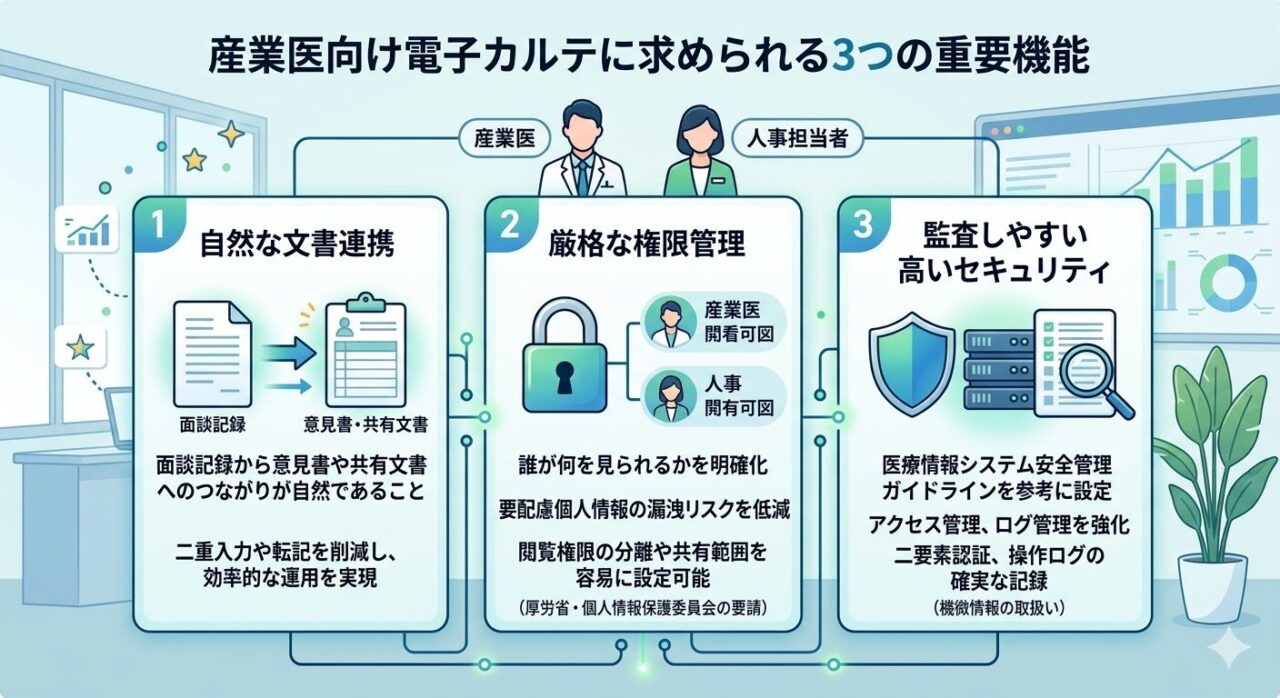 つまり、産業医向け電子カルテで重要なのは、「たくさん記録できること」以上に、情報を適切に分けて扱えることです。