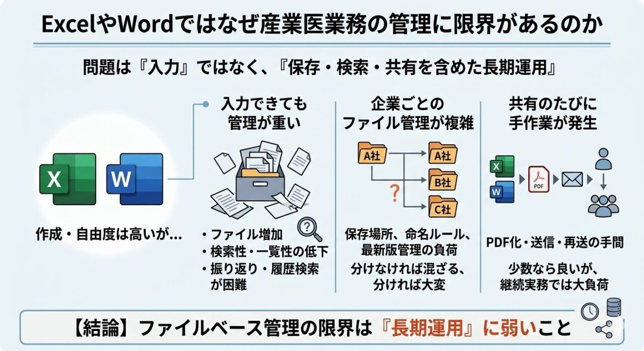 ExcelやWordは、現場で最もよく使われるツールです。手元にあり、自由度が高く、テンプレートも作りやすい。実際、これらのツールで長年うまく運用してきた産業医も少なくありません。