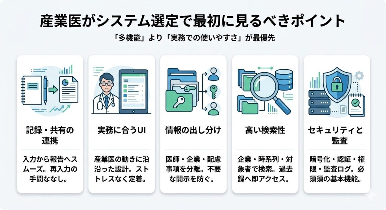 産業医向けクラウドカルテを選ぶときに最も重要なのは、「多機能かどうか」ではありません。