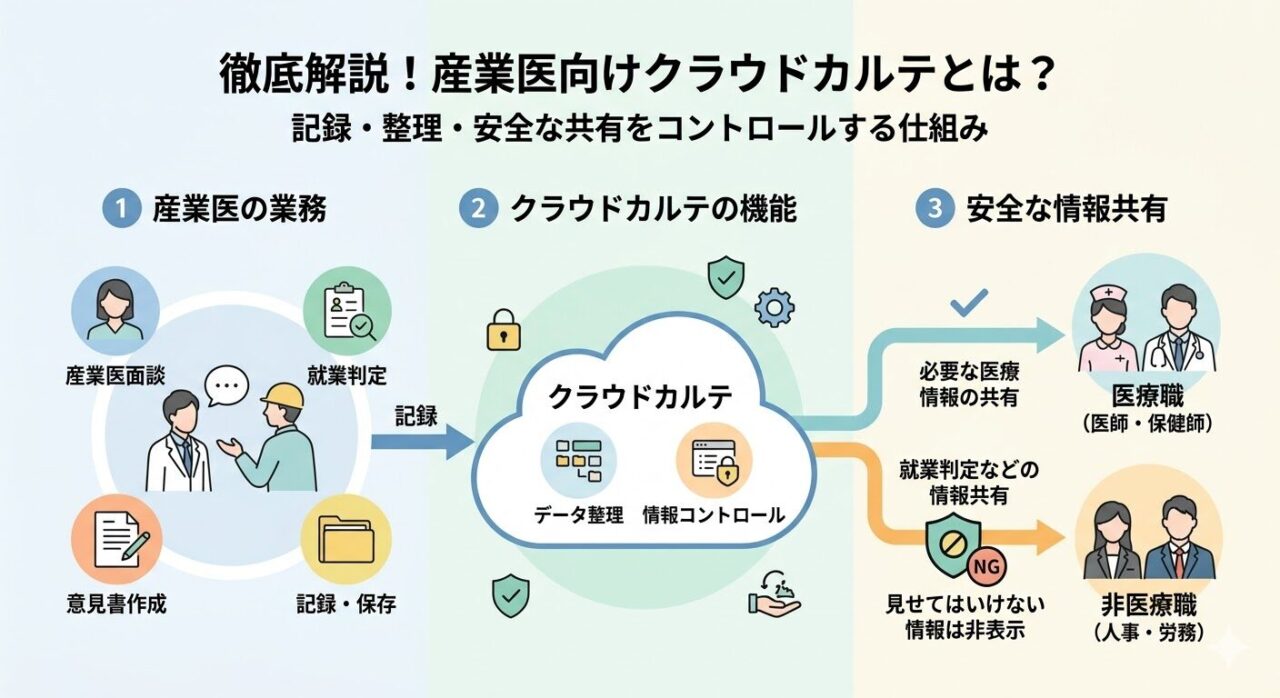 産業医向けクラウドカルテは、病院の電子カルテを小さくしたものではありません。産業医が把握すべき詳細情報と、企業に共有すべき情報を分けながら、安全に記録・出力・共有するための仕組みです。