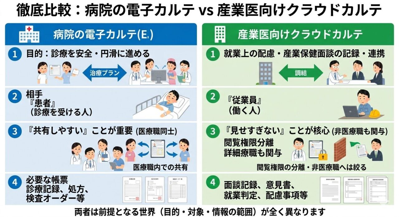 ただし、ここで注意したいのは、産業医向けクラウドカルテは病院の電子カルテの簡易版ではないということです。病院の電子カルテと産業保健のクラウドカルテでは、目的も、共有の考え方も、必要な設計も大きく異なります。