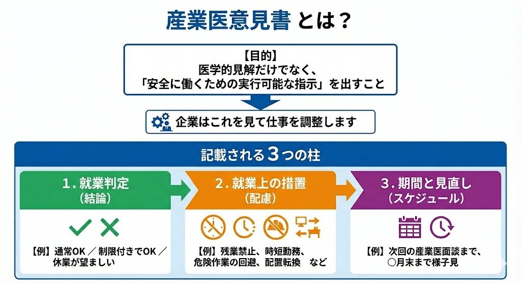 産業医意見書(就業上の措置に係る意見書)は、「医師が医学的な内容を書いた紙」ではなく、会社が安全に働かせるための“運用の指示書”です。