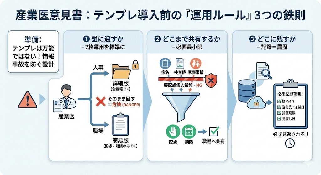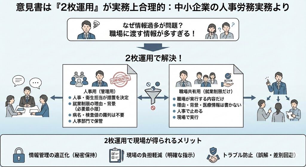 - 意見書は「人事用(管理用)」と「職場共有用(配慮だけ)」の2枚運用にすると事故が激減する