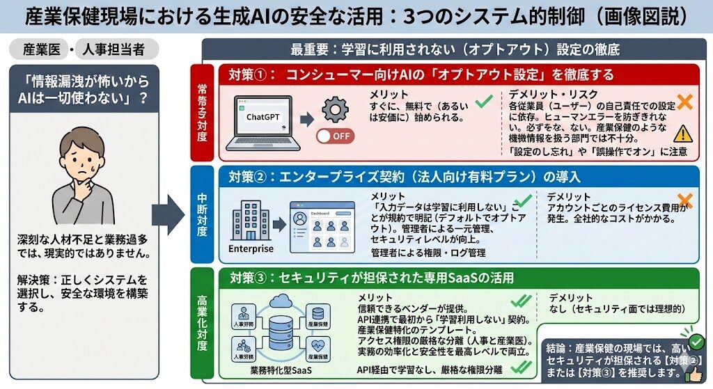 産業医や人事担当者がAIを利用する際は、必ず「学習に利用されない(オプトアウト)設定」になっているか、あるいはエンタープライズ契約や専用のSaaSを利用して、セキュリティ要件を担保してください。